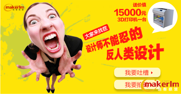 5月15日,創客聯盟協同上市公司拓斯達,共同舉辦--大家來找茬:設計師不能忍的反人類設計。此次活動以一種另類的、惡搞的形式,讓大眾參與,加入到發現中國設計現存問題的大隊伍中來。本次活動的最終大獎有拓斯達提供,價值1.5萬元的3D打印機一臺。活動截止時間是5月31日。